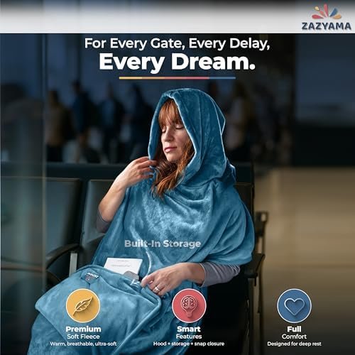 Experience in-flight calm with ultra-soft fleece and a light-blocking hood designed to fit over headphones. This travel blanket wraps you in warmth and serenity, making long flights or layovers more restful and stress-free.