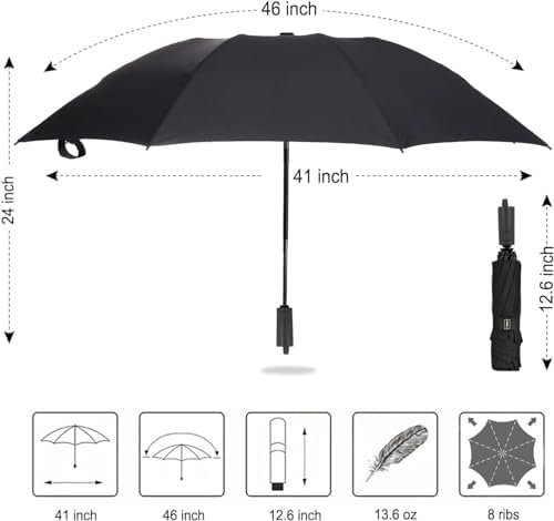 COMPACT, PORTABLE AND EASY CARRYING: This is an upgrade design of the longer reverse folding umbrella, light weight and more easy carry. This reverse umbrella is easy to store in your car, your briefcases, backpacks, tavel bags etc. It is perfect for travel, business, camping, fishing, and daily use. Suitable for men and ladies.