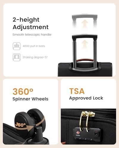 【Secure & Reliable Travel Companion】: Glide smoothly through bustling airports with our carry on luggage featuring 360° spinner wheels, designed for silent and durable travel. The telescopic handle, made from aircraft-grade aluminum, offers two adjustable heights to reduce wobble. Equipped with a TSA-approved lock, this suitcase with wheels ensures your essentials are secure and compliant with airport screenings.
