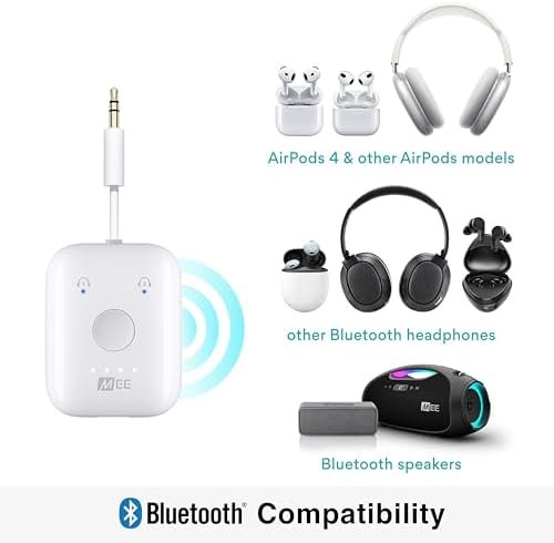 BLUETOOTH AUDIO TRANSMITTER FOR AIRPLANES: easily stream wireless stereo audio from in-flight entertainment systems to up to two AirPods or other Bluetooth headphones. Works with AirPods Pro 2, AirPods 4, AirPods Max, and other AirPods models, as well as other Bluetooth headphones and speakers.