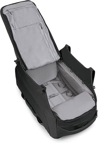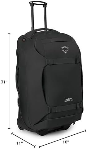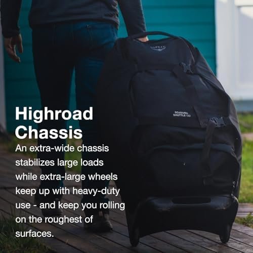 Designed for epic travel adventures and international journeys, the Osprey Sojourn Shuttle 100 wheeled duffel is a rugged, high-volume gear hauler. Crafted with heavy-duty, bluesign APPROVED, 100% recycled high-tenacity nylon main body and bottom fabrics, it stands up to rough handling from airport to basecamp. A massive main compartment stores everything, while an exterior access boot bin keeps dirty gear and hiking boots separate from clean items. An extra-wide HighRoad chassis stabilizes large loads with an injection-molded ABS base and oversized 110 mm wheels keep up with heavy-duty use and roll easily over uneven terrain. Iconic WingJacket compression provides extra padding that protect contents and keep loads under control. When not fully stuffed, bag compresses to a smaller size. TSID luggage registration and a retractable ErgoGrip handle round out the Sojourn Shuttle 100 as a trusted companion for your next global adventure. Whether you’re headed to Costa Rica or Kathmandu, this durable travel bag delivers performance and organization in one streamlined package.