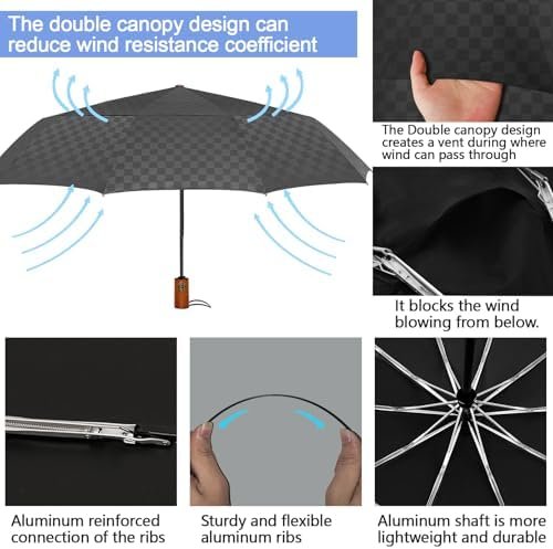 【Wind Resistant】Large rain umbrella has a double canopy design. The gaps between the double canopy lie flat and watertight in the rain but open when the wind catches the umbrella from underneath, releasing air pressure and discouraging inversion. The double-canopy golf umbrella helps prevent strong winds from turning the umbrella inside out.