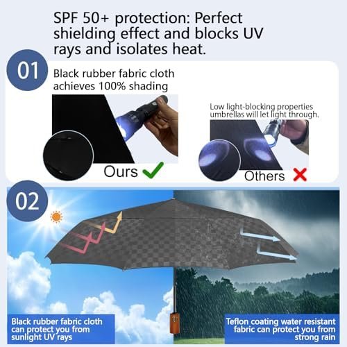 【High Quality & Unique Design】SATOL windproof golf umbrella has a wide canopy that provides abundant coverage. The travel umbrella is large enough to protect 2 people from the rain. The folding umbrella is made of a 310T teflon fabric that is fully water-resistant. This UPF 50+ Black rubber anti-UV fabric also gives you perfect shielding effect and blocks UV rays and isolates heat. The pattern is fommed by high temperaturedie-casting, permanently colorfast, safer and healthier.