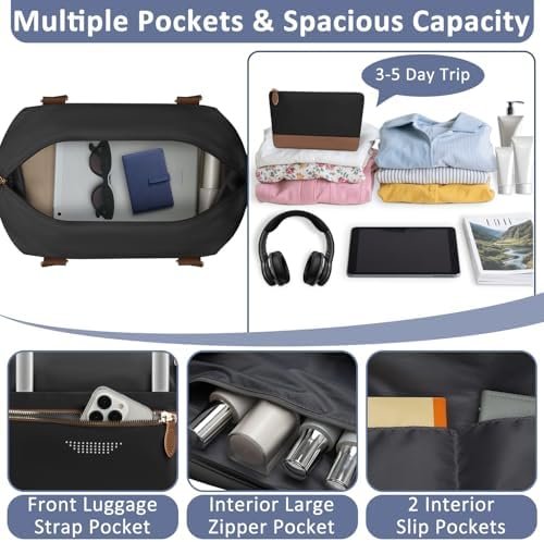 Roomy Capacity & Functional Pockets: ELONGRIVER’s duffle bag for travel has a spacious interior with one large zippered pocket for secure storage and two slip pockets for small items. The exterior includes a convenient small zipper pouch on the luggage pullover strap for quick access to essentials. With side snaps for expandable use and multiple organizational pockets, these weekender bags for women are perfect for trips—easily holding all your essentials for 3–5 days.